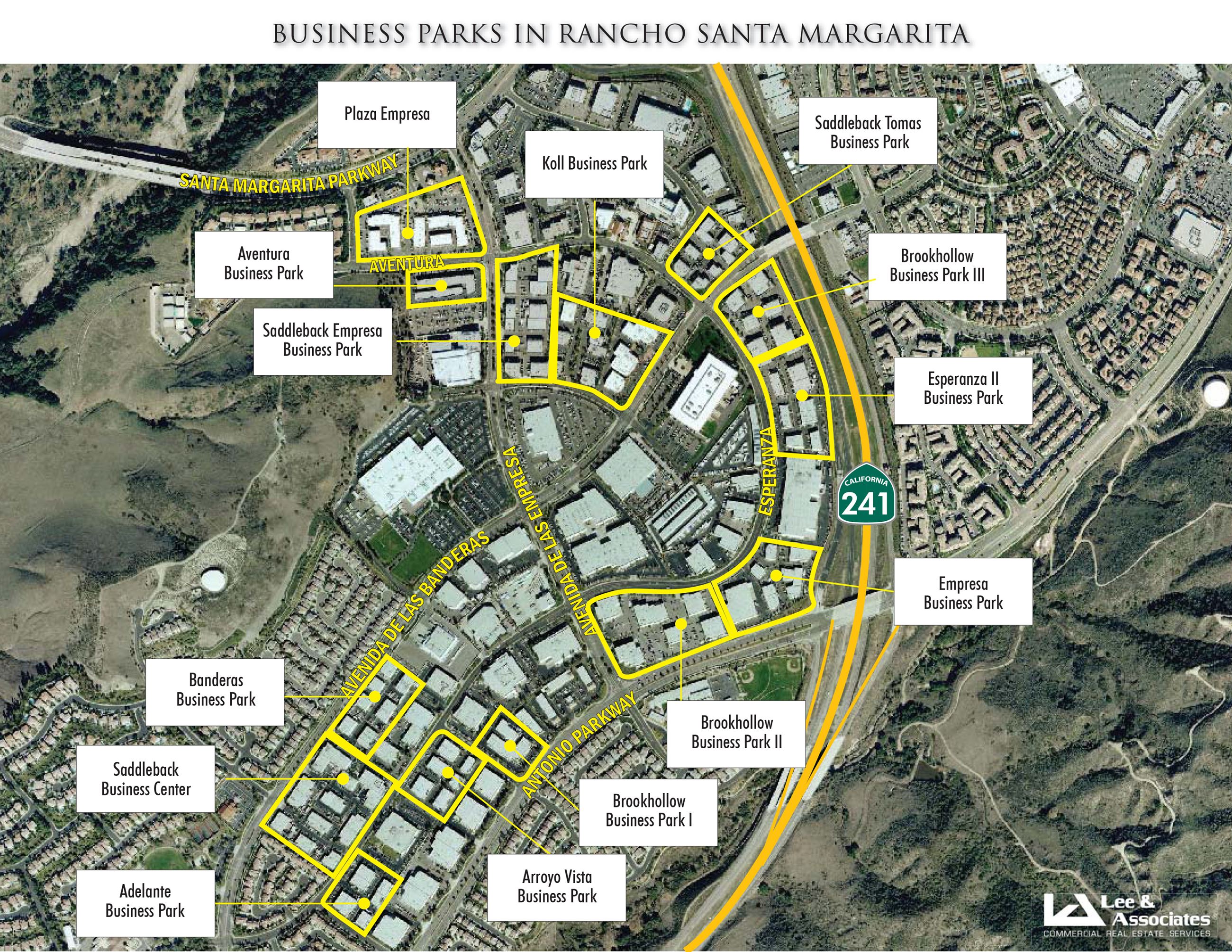Rancho Santa Margarita has over 250 acres of developed light industrial uses comprised of approximately 3.8 million square feet of light industrial building area. The City has over 4 miles of north and southbound frontage along the 241 Toll Road with an average daily trip of 43,000 vehicles. Most of the the City's Business Park centers are located along Santa Margarita Parkway and Antonio Parkway, 2 of the City's major arterial streets, which have approximately 82,000 daily vehicle trips. To learn more, view the Business Park Map (PDF).