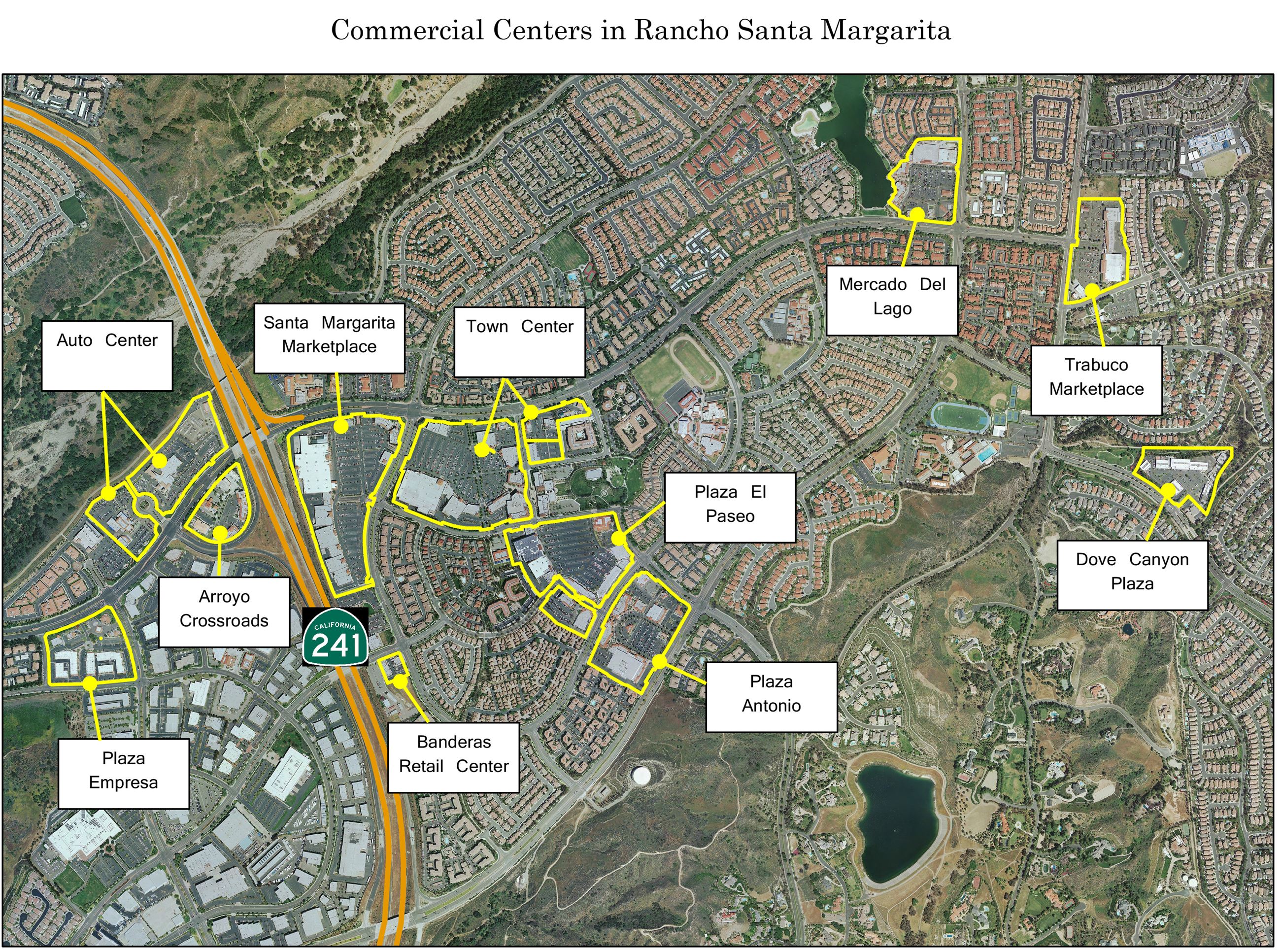 Rancho Santa Margarita has over 165 acres of developed commercial land comprised of 11 different shopping centers. For information regarding the zoning districts and permitted uses within the commercial centers, click on the Commercial Districts text in the menu to the left of the screen.